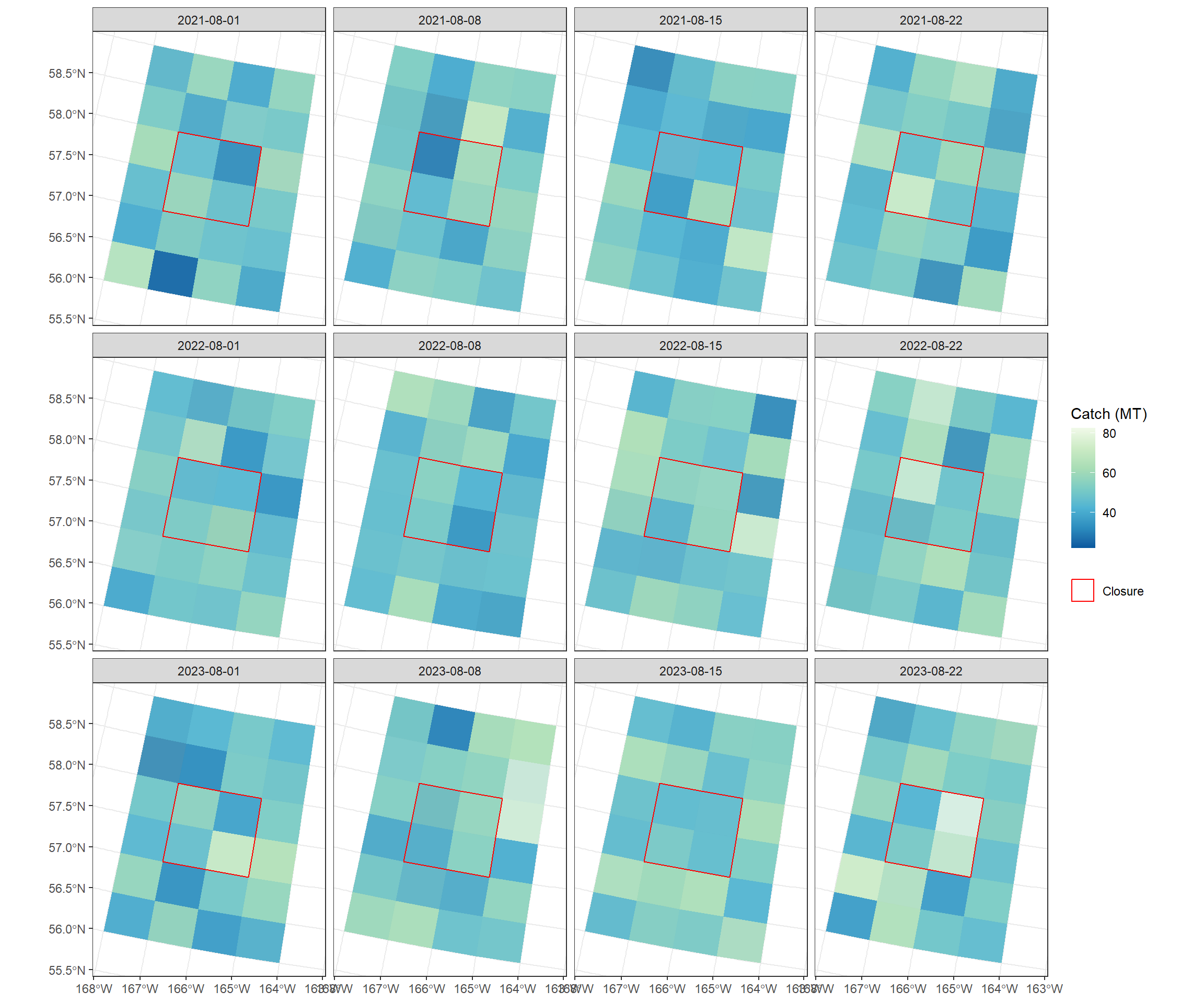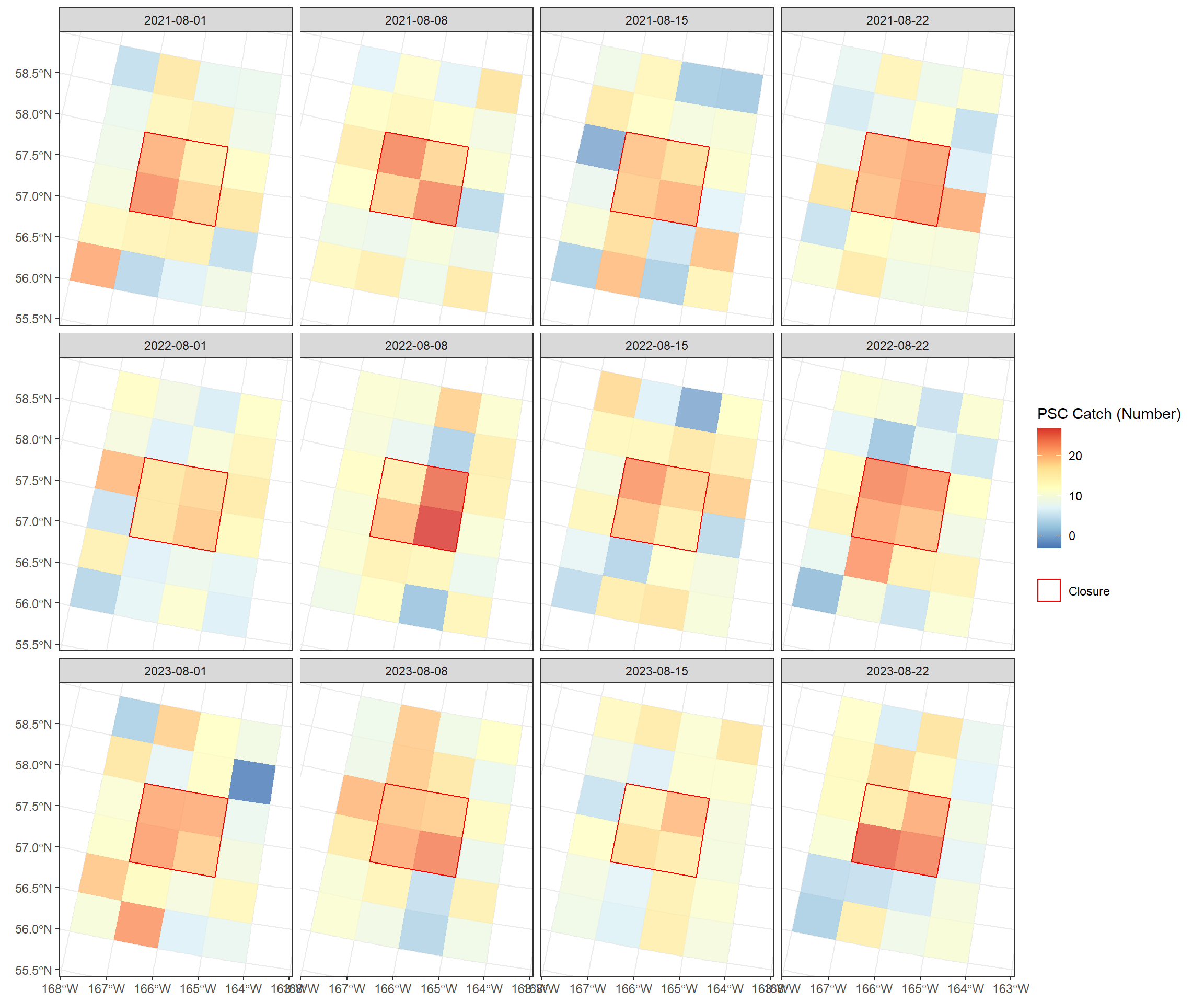 ggplot() +# Use subsetting [ ] to filter the SpatVector rows for Species_A tidyterra::geom_spatvector(data = catch_data[catch_data$SPECIES =="Species_A", ], aes(fill = PSC_TOTAL_COUNT), alpha =0.8, col =NA, na.rm =TRUE) +scale_fill_distiller(palette ="RdYlBu", name ="PSC Catch (Number)") +# Keep the closure overlay (this is independent of species) tidyterra::geom_spatvector(data = closure2, aes(color ="Closure"), fill =NA, alpha =0.5, lwd =0.5) +scale_color_manual(values =c("Closure"="red"), name =NULL) +facet_wrap(~WEEK_END_DATE, ncol=4) +theme_bw() +theme(plot.title =element_text(hjust =0.5), axis.title =element_blank())