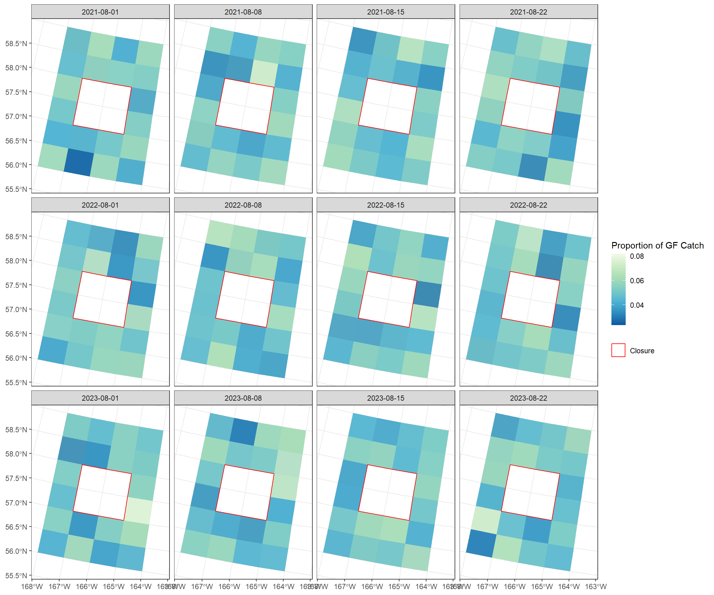 #| label: rates-props#| echo: false# Identify Inside/Outside after a closure would have occurred ---#identify the areastat_areas_closed <- closure.stat.areas #identify which hauls occurred inside/outside the closed areaall_psc_impacted_cluster <- all_psc_impacted %>%mutate(inside =ifelse(STAT_AREA %in% stat_areas_closed, "yes", "no"))# -- inside catch -- ##isolate hauls occurring inside closed areagf_inside_cluster <-subset(all_psc_impacted_cluster, inside =="yes")#sum gf and psc inside closed area for later calcsgf_inside_summary <- all_psc_impacted_cluster %>%filter(inside =="yes") %>%group_by(SPECIES, YEAR, WEEK_END_DATE, PROCESSING_SECTOR) %>%summarise(tons_gf_inside_wk =sum(GF_TOTAL_CATCH_MT, na.rm =TRUE),psc_measure_inside_wk =sum(PSC_TOTAL_COUNT, na.rm =TRUE),.groups ="drop" )# Calculate mean PSC rates per Stat Area (Outside only)sum.stat.timeseries.gf_all <- all_psc_impacted_cluster %>%filter(inside =="no") %>%group_by(SPECIES, YEAR, WEEK_END_DATE, STAT_AREA, PROCESSING_SECTOR) %>%summarise(tons_gf_wk =sum(GF_TOTAL_CATCH_MT, na.rm =TRUE),mean_psc_wk =mean(PSC_TOTAL_COUNT, na.rm =TRUE),mean_gf_tons_wk =mean(GF_TOTAL_CATCH_MT, na.rm =TRUE),.groups ="drop" ) %>%mutate(mean_psc_rate_wk = mean_psc_wk / mean_gf_tons_wk)# Calculate total catch outside (denominator for proportions)gf.outside.total <- all_psc_impacted_cluster %>%filter(inside =="no") %>%group_by(SPECIES, YEAR, WEEK_END_DATE, PROCESSING_SECTOR) %>%summarise(tons_gf_outside_total =sum(GF_TOTAL_CATCH_MT, na.rm =TRUE),.groups ="drop" )# Join and calculate the redistribution proportionsum.stat.timeseries.gf_all3 <- sum.stat.timeseries.gf_all %>%left_join(gf.outside.total, by =c("SPECIES", "YEAR", "WEEK_END_DATE", "PROCESSING_SECTOR")) %>%mutate(proportion_outside_wk = tons_gf_wk / tons_gf_outside_total)