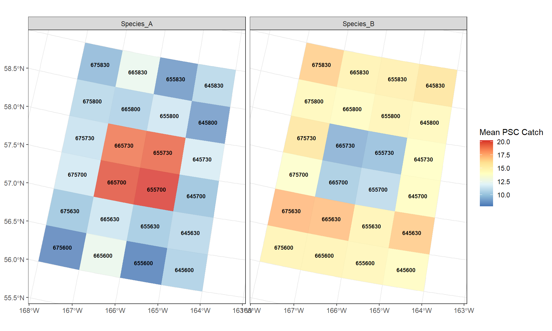 In this example, the average highest PSC catch of Species A are in areas 665730, 665700, 655730, 655700, while these areas have the lowest PSC catch for Species B.