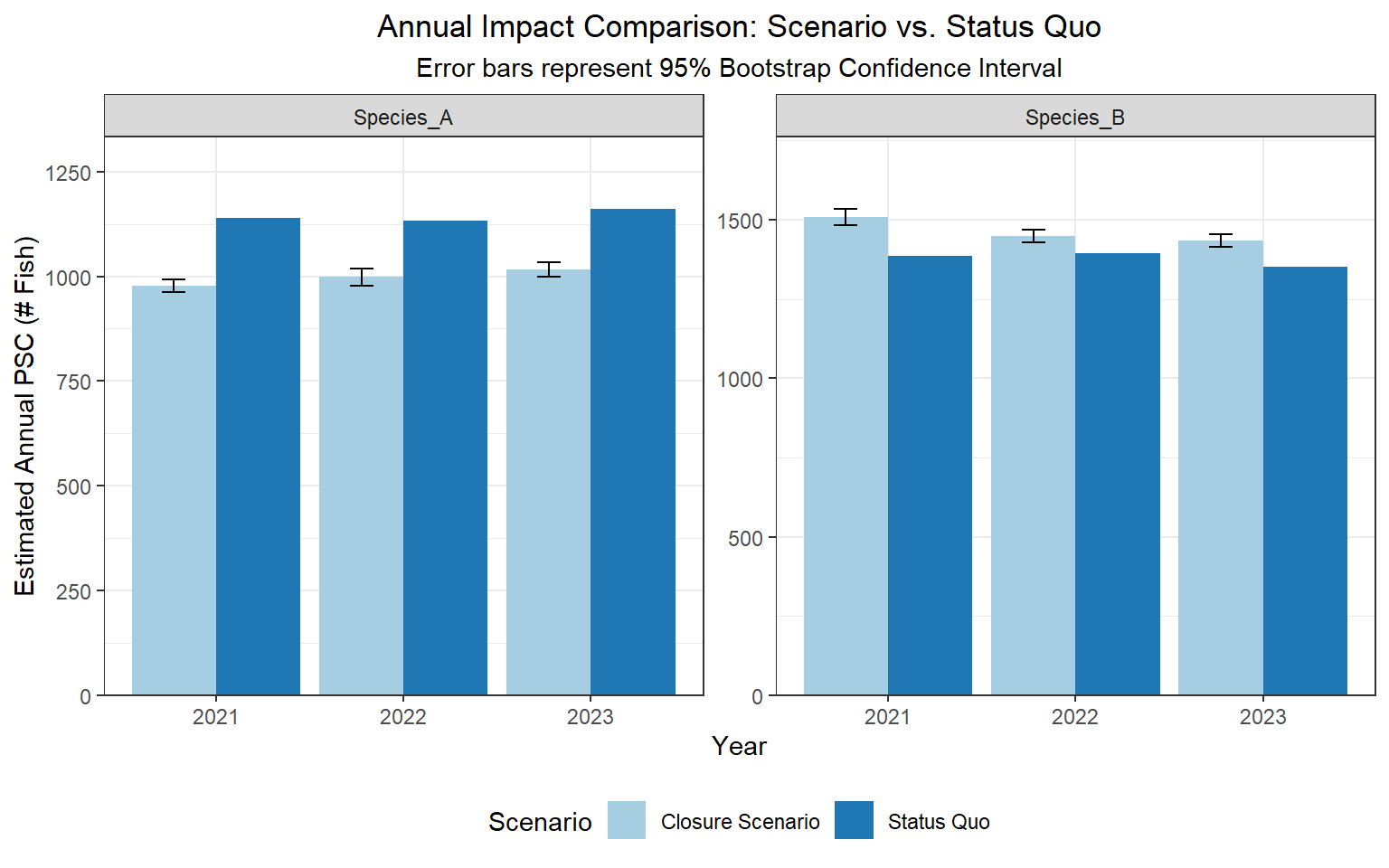 # --- 12. Final Status Quo Comparison ---# 1. Clean build of the annual comparison data (Anchored by SPECIES)total.join.plot.annual_clean <- all_psc_status_quo_annual %>%left_join(total.join.plot.annual, by =c("SPECIES", "YEAR")) %>%rename(psc_statusquo = sum_psc_status_quo, psc_change = est_change_fleet) %>%mutate(psc_change =replace_na(psc_change, 0),net_new_PSC = psc_statusquo + psc_change) %>%# Join bootstrap CIs by SPECIES and YEARleft_join(boot_annual_ci, by =c("SPECIES", "YEAR")) %>%# 2. THE VERTICAL FIX (Relative to net_new_PSC)mutate(half_width_lower = mean_change - lower_change,half_width_upper = upper_change - mean_change,ymin_val = net_new_PSC - half_width_lower,ymax_val = net_new_PSC + half_width_upper ) %>%# 3. Pivot for ggplotpivot_longer(cols =c("net_new_PSC", "psc_statusquo"),names_to ="psc_type",values_to ="psc_amount" ) %>%mutate(ymin =ifelse(psc_type =="net_new_PSC", ymin_val, NA),ymax =ifelse(psc_type =="net_new_PSC", ymax_val, NA) )# 4. Final Plot with Faceting by Speciesggplot(total.join.plot.annual_clean, aes(x =factor(YEAR), y = psc_amount, fill = psc_type)) +geom_bar(stat ="identity", position =position_dodge(width =0.9)) +geom_errorbar(aes(ymin = ymin, ymax = ymax), position =position_dodge(width =0.9), width =0.25, na.rm =TRUE) +# Add faceting so you see the "Opposite" effects side-by-sidefacet_wrap(~SPECIES, scales ="free_y") +scale_y_continuous(expand =expansion(mult =c(0, 0.15))) +theme_bw() +labs(title ="Annual Impact Comparison: Scenario vs. Status Quo",subtitle ="Error bars represent 95% Bootstrap Confidence Interval",x ="Year", y ="Estimated Annual PSC (# Fish)") +scale_fill_brewer(palette ="Paired", name ="Scenario", labels =c("Closure Scenario", "Status Quo")) +theme(plot.title =element_text(hjust =0.5),plot.subtitle =element_text(hjust =0.5),legend.position ="bottom")